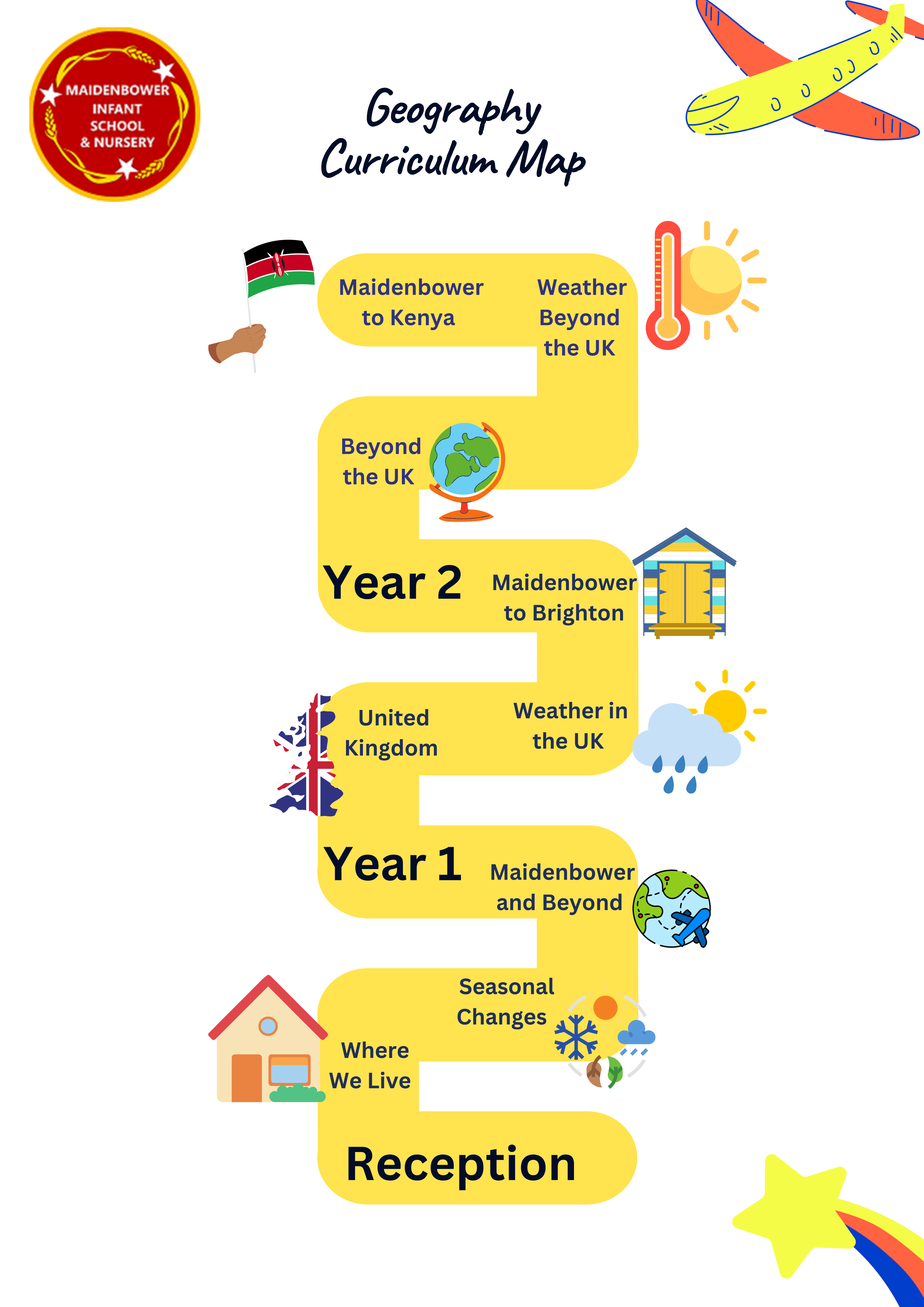 Geography at Maidenbower Infant School follows an ambitious and progressive knowledge and skills based sequence of learning from Nursery through to Year 2. This is based on the Statutory National Curriculum, but we ensure our curriculum is adapted to be bespoke for our school, our local area and community needs. We believe in children learning about their local environment first in Reception, children in Year 1 begin to branch out their understanding of the world by developing a sound knowledge of the United Kingdom and its countries (national) and then Year 2 broadening their knowledge of the wider world and comparing the UK with other countries (international). This ensures that children can build on prior knowledge and skills and will therefore know more and remember more over time. We believe that ‘what happens early, happens for a lifetime’ and this is kept at the forefront with all geographical teaching and learning. We alternate our Geography and History topics to ensure that children receive a well-rounded teaching of the humanities subjects throughout the year.