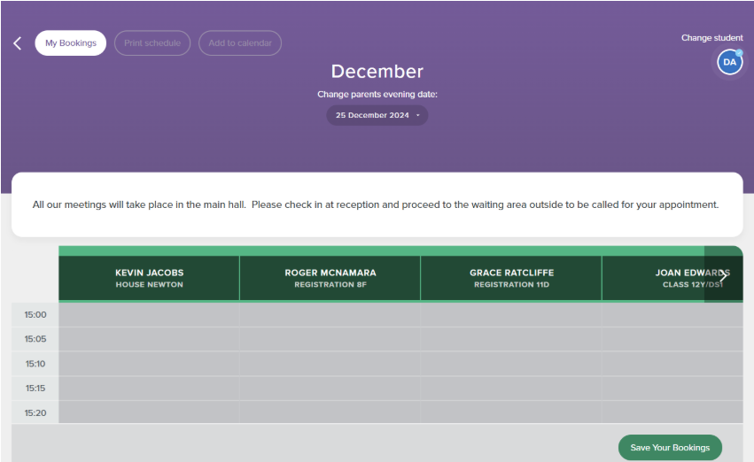 Find the teacher and time you’d like to book and click to reserve the time slot. The selection will show in green with the word “RESERVED”. The time allocated for each slot will be automatically populated.